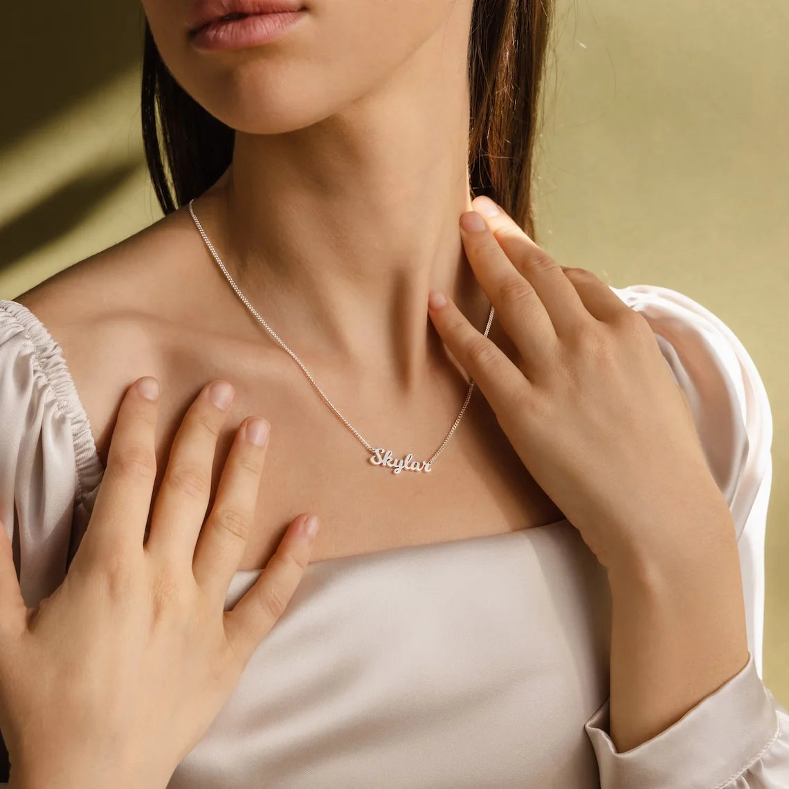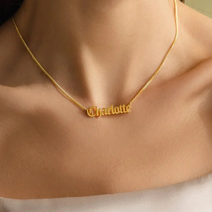 See elegantne nimekaelakee kombineerib klassikalise Old English kirja modernse disainiga, luues pilkupüüdva ja tähendusliku ehte.